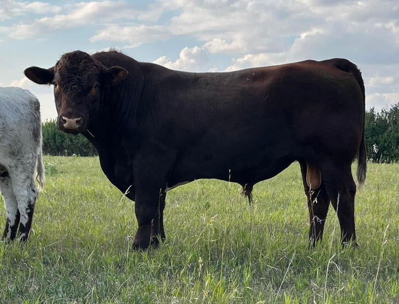Here is a young bull we are proud to have raised on the ranch via embryo transfer. Sired by none other than the well known Crooked Post Stockman 4Z, out of a good Waukaru/Horseshoe Creek female. Ruddy has been a standout from the very beginning - cherry red & long bodied with a load of natural muscling. Ruddy boasts admirable rib shape & middle with excellent extension into his hip - an incredibly correct, powerful & handy bull.